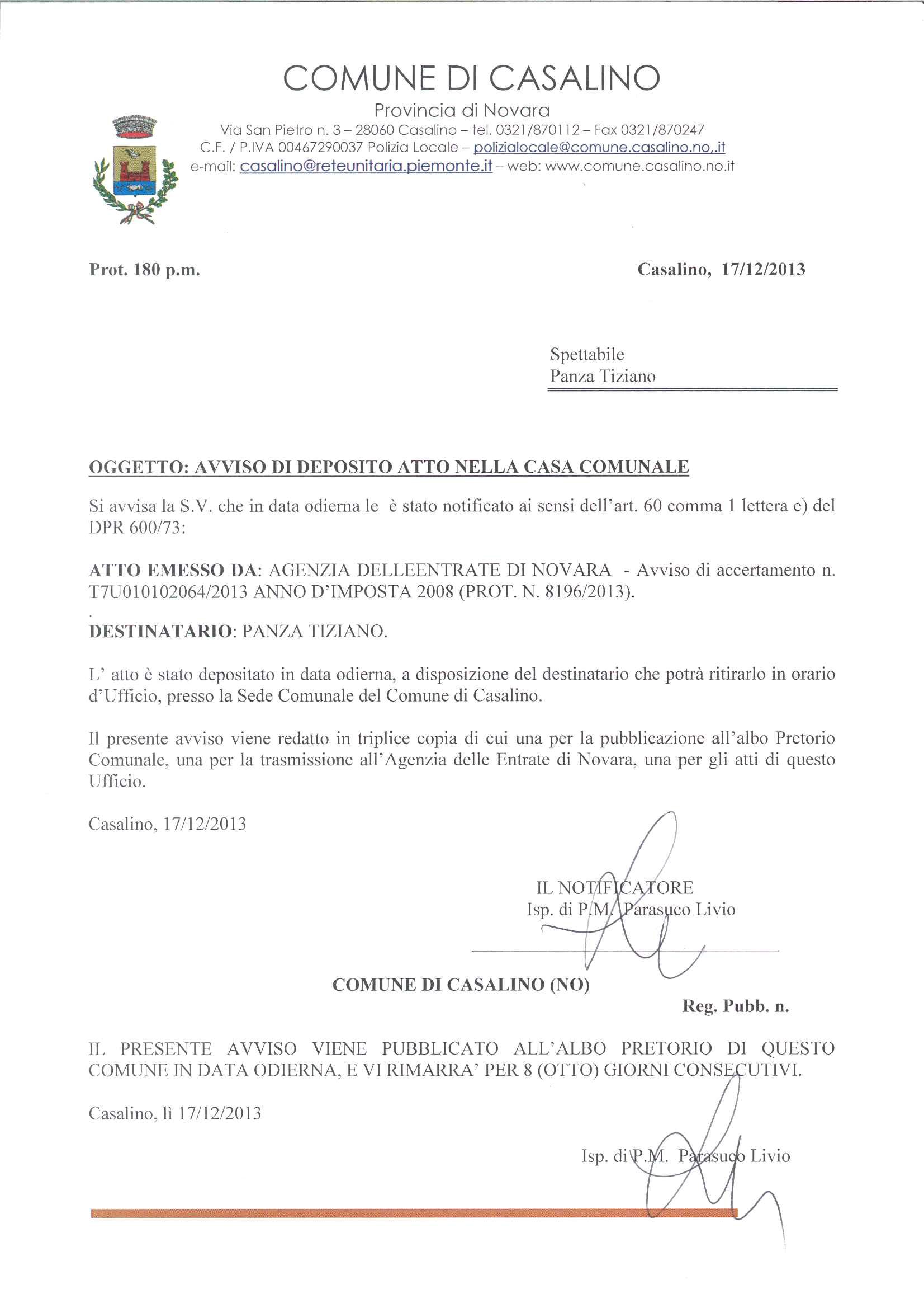 avviso di deposito atto notificato ai sensi dell'art. 60 comma 1 lettera e del DPR 600/73 nella casa comunale.
