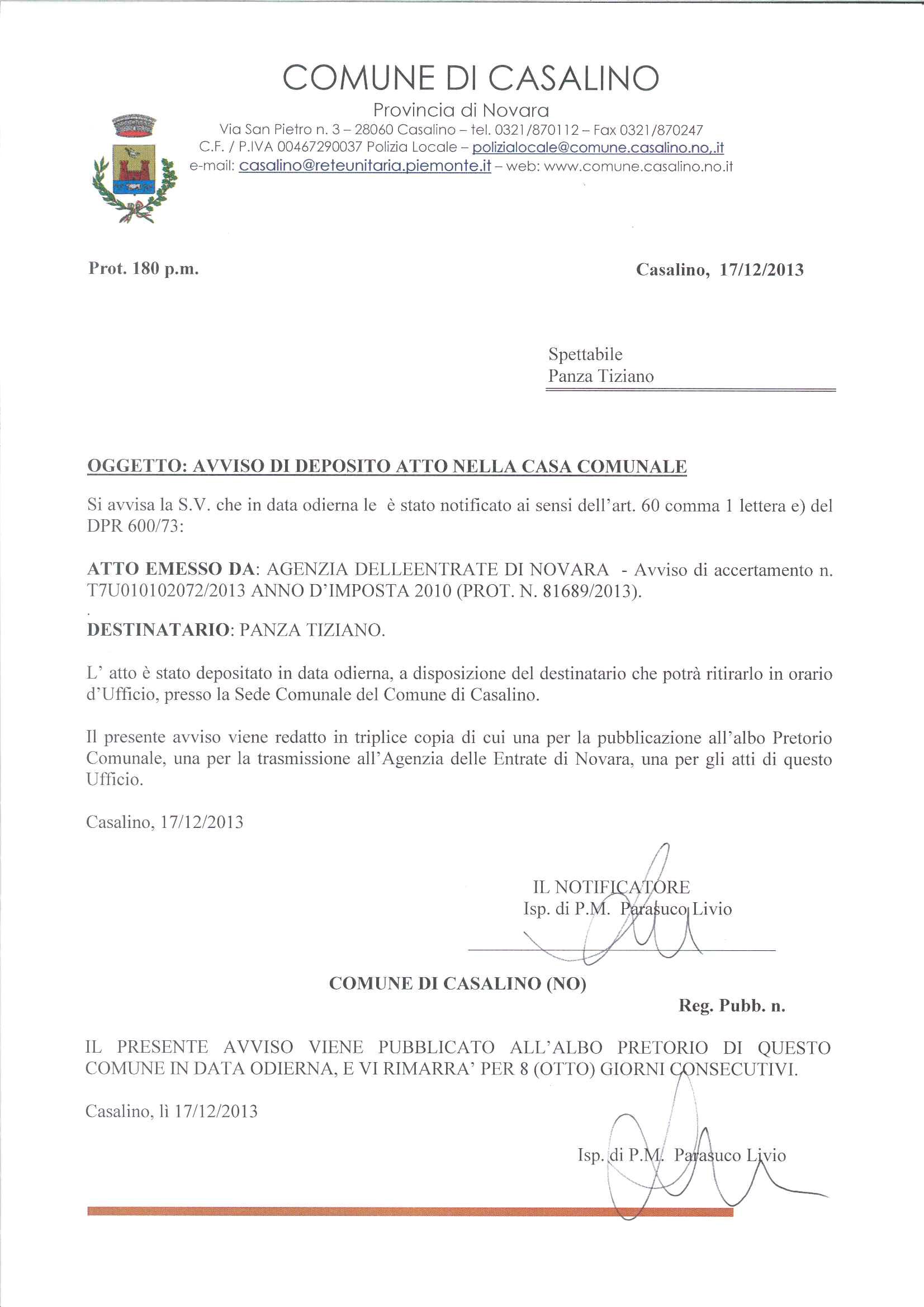 avviso di deposito notifica atto Agenzia Entrate di Novara