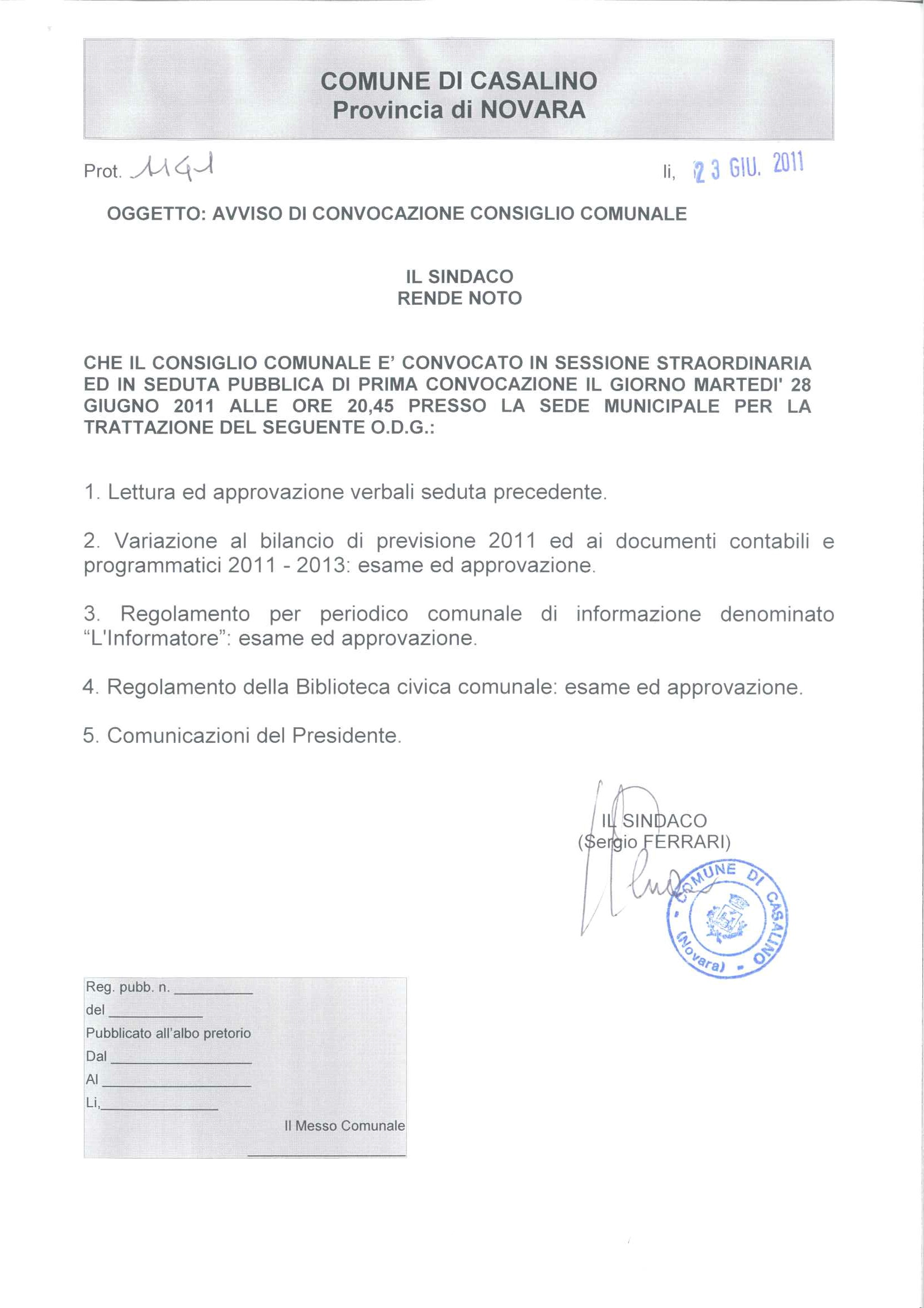 CONVOCAZIONE CONSIGLIO COMUNALE DEL 28/06/2011 ORE 20,45.
