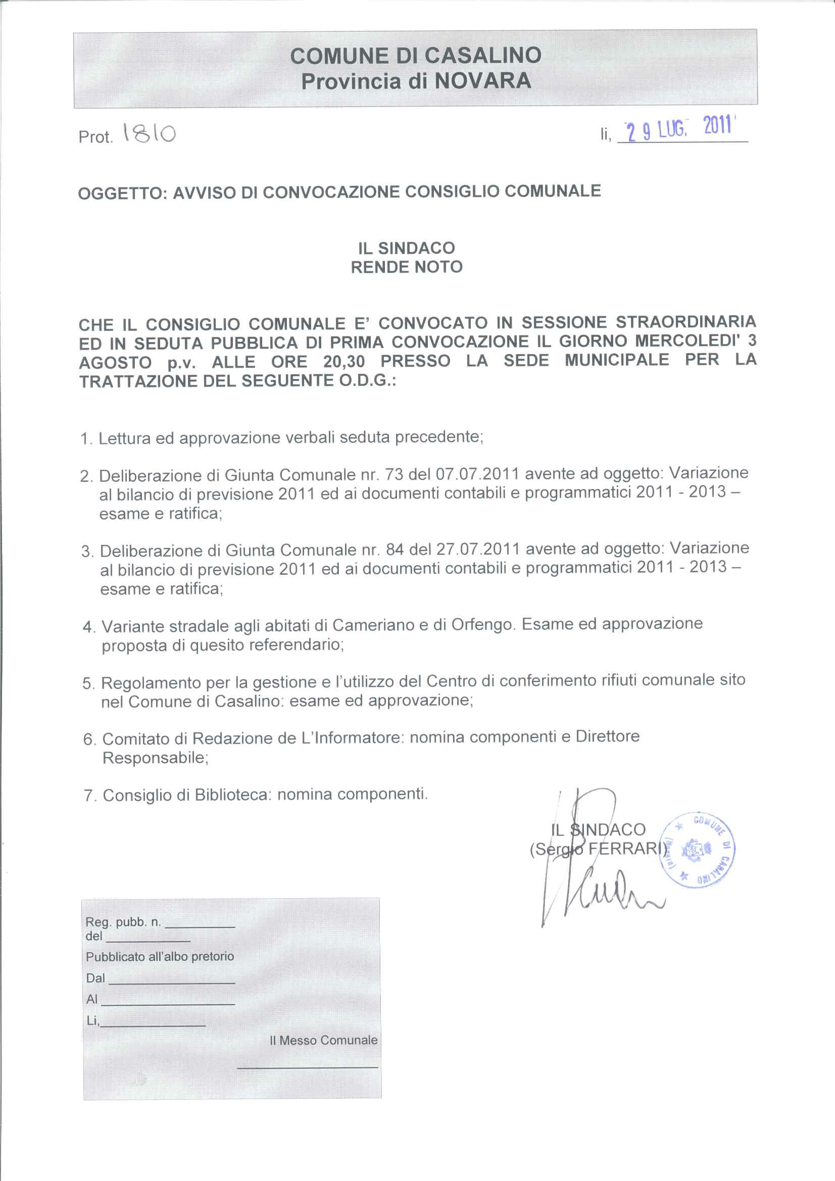 AVVISO DI CONVOCAZIONE CONSILIO COMUNALE - 03 AGOSTO 2011 ORE 20,30.