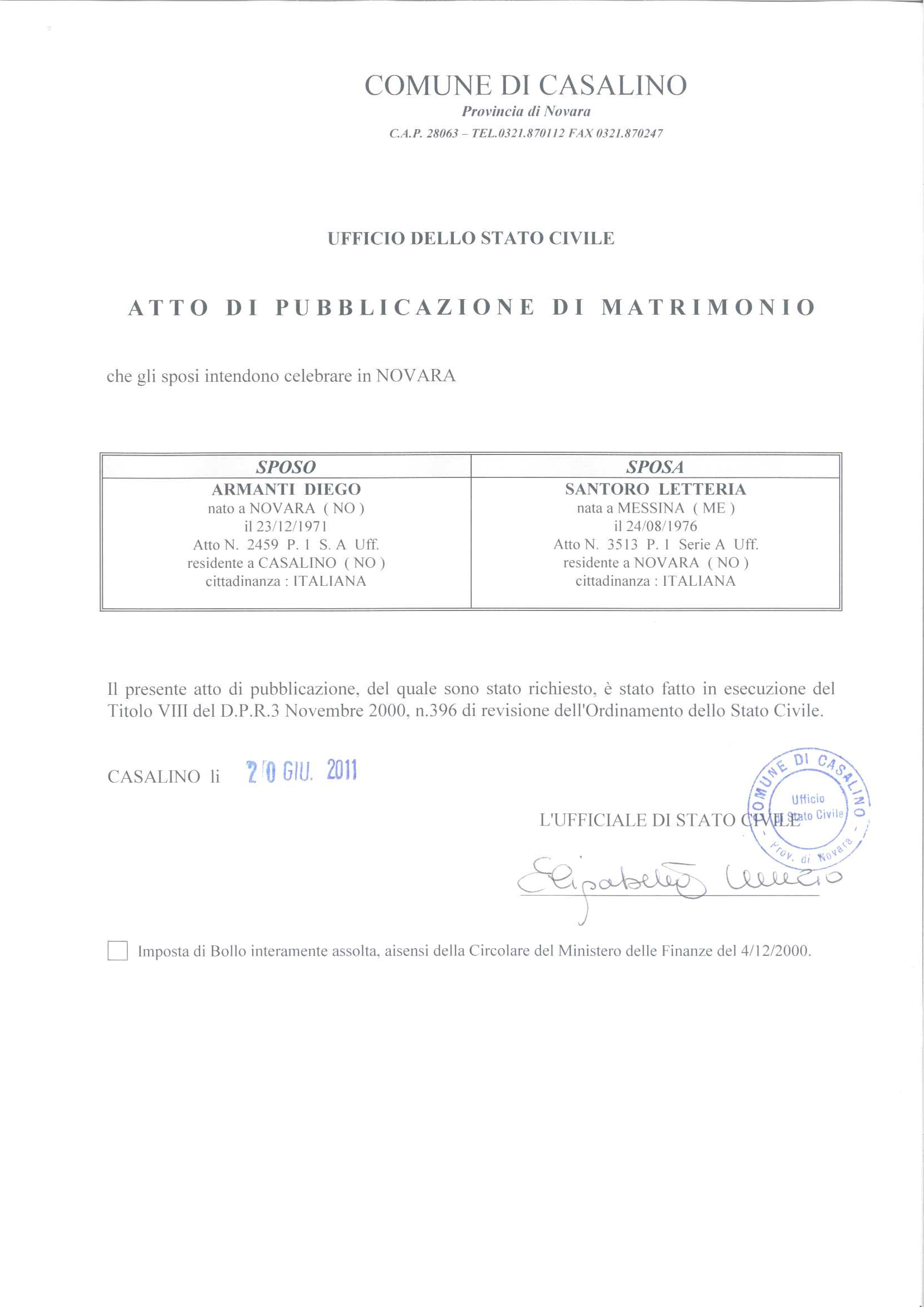 PUBBLICAZIONI DI MATRIMONIO DI ARMANTI DIEGO / SANTORO LETTERIA