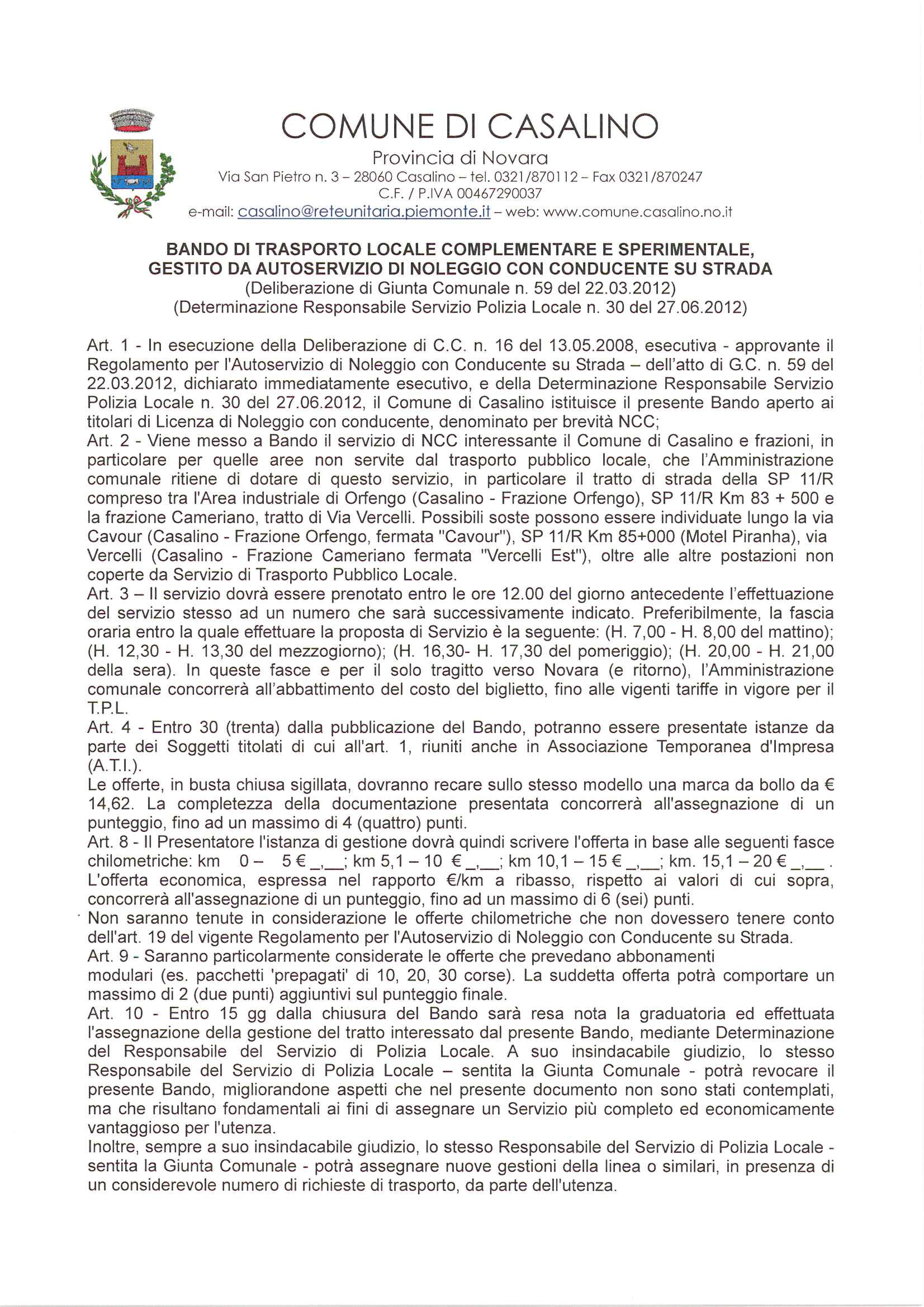 Bando di trasporto locale complmentare e sperimentale gestito da autoservizio di noleggio con...