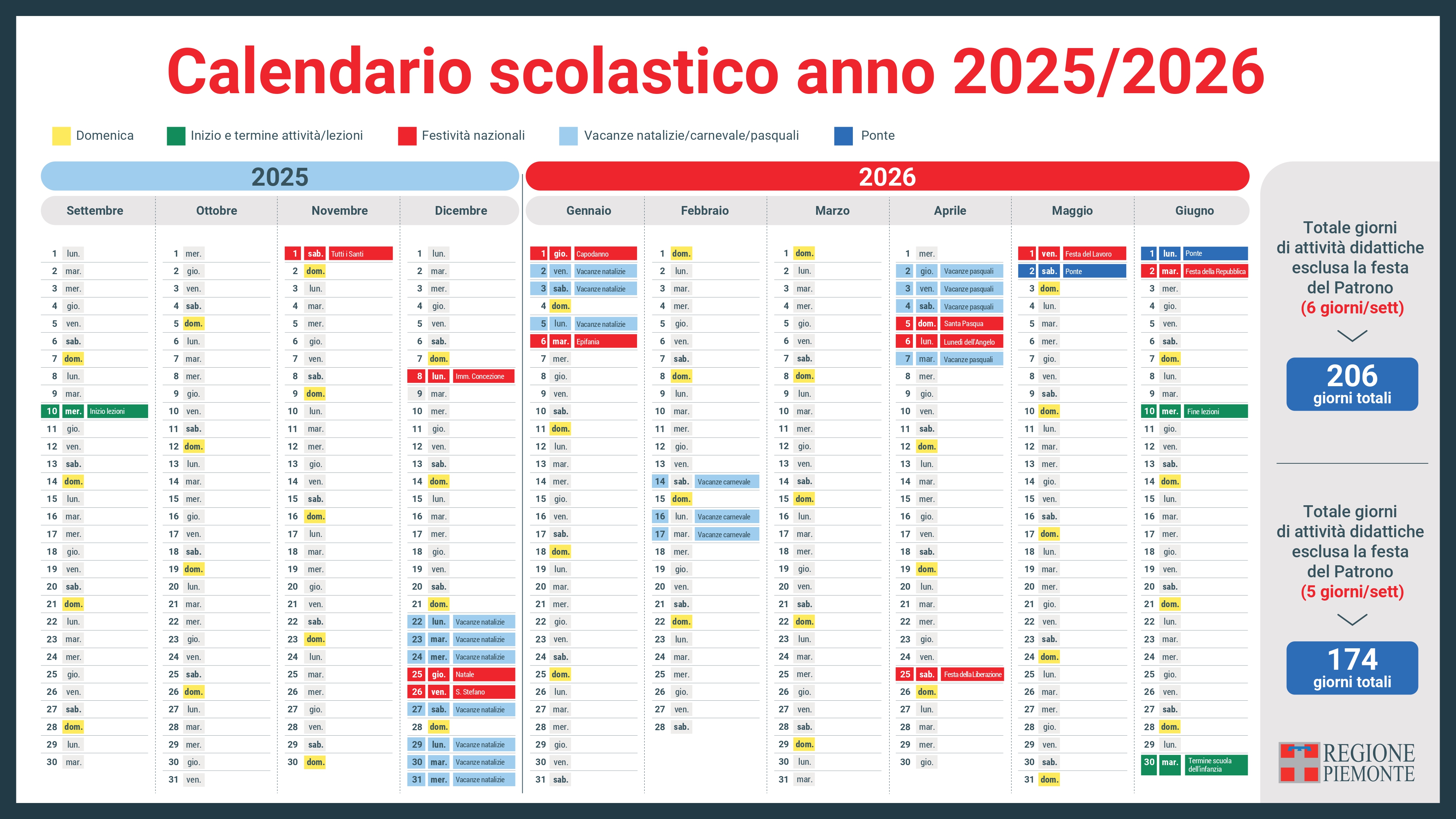 Le lezioni nella scuola primaria e nella scuola secondaria di primo e di secondo grado in Piemonte si svolgeranno da mercoledì 10 settembre 2025 a mercoledì 10 giugno 2026, per un totale di 206 giorni negli istituti in cui le lezioni si tengono anche al sabato, mentre 174 sono i giorni per le scuole dove si resta in classe fino al venerdì. In considerazione del servizio svolto, le scuole dell'infanzia hanno facoltà di anticipare l'inizio dell'attività didattica, che terminerà martedì 30 giugno 2026.