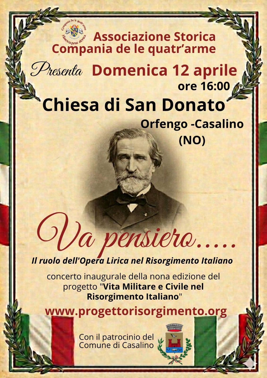 L'Associazione Storica Compagnia de le quatr'arme, con il patrocinio del Comune di Casalino, presenta Domenica 12 aprile alle ore 16:00, presso la Chiesa di San Donato a Orfengo - Casalino, il concerto inaugurale della nona edizione del progetto "Vita Militare e Civile nel Risorgimento Italiano".