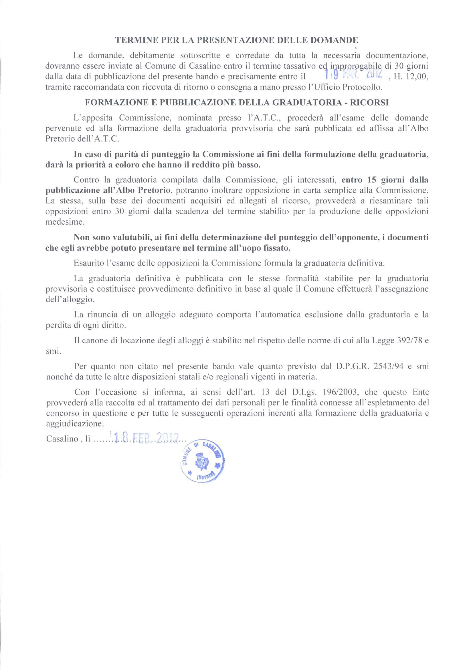 Bando di concorso per l'assegnazione in locazione di alloggi di edilizia residenziale sociale agevolata siti nel comune di CASALINO - frazione PONZANA.