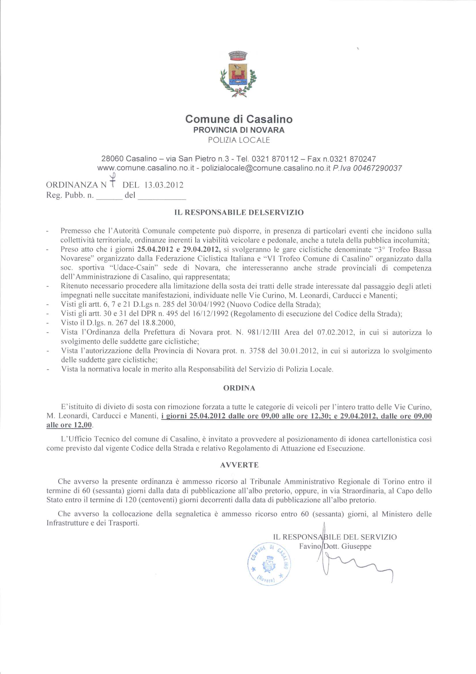 Divieto di sosta con rimozione forzata Vie Curino, Leonardi M., Carducci e Manenti nei giorni 25/04 e 29/04 c.a.