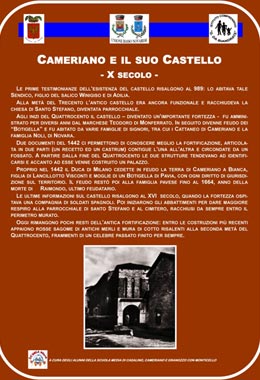 The earliest evidence of the castle's existence dates back to 989. In the mid-fourteenth century the ancient castle was still functional and enclosed the church of Santo Stefano, which later became a parish church. At the beginning of the fifteenth century the castle, transformed into an important fortress, was administered for several years by the Marquis Teodoro di Monferrato. Later it became a fief of the Botigella and was inhabited by various families of lords, including the Cattaneo di Cameriano and the Noli family of Novara. Two documents dated 1442 allow us to better recognise the fortification, divided into two parts (a recetto and a castrum) contiguous to each other and surrounded by a moat. In 1442 the Duke of Milan ceded the land of Cameriano to Bianca, daughter of Lancillotto Visconti and wife of a Botigella of Pavia, with every right of jurisdiction over the territory. The most recent information about the castle dates back to the 16th century when the fortress housed a company of Spanish soldiers. After this demolitions started giving greater breathing space to the parish of Santo Stefano and the cemetery, which had always been enclosed within the walled perimeter.